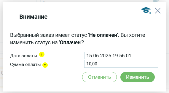 Если для изменнеия статуса оплаты выбран один заказ, то появляется модальное окно с двумя полями: