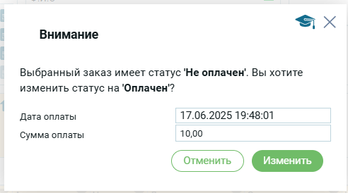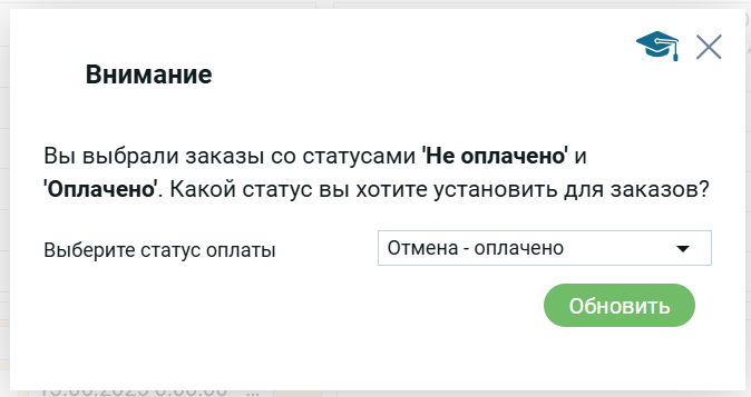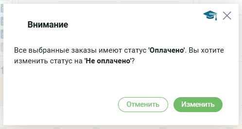 В зависимости от текущего (первоначального) статуса заказа при попытке изменить статус оплаты, система отображает одно из трёх модальных окон:
