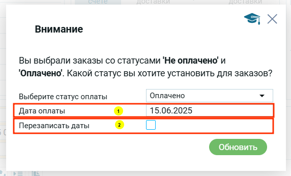 Если поставить галочку в чек боксе «Перезаписать дату», все заказы для которых меняется статус оплаты сохранятся с новой датой.