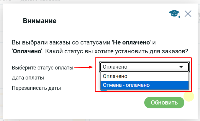 В поле «Выберите статус оплаты» есть выпадающий список с двумя вариантами для выбора; «Оплачено» и «Отмена-оплачено«.