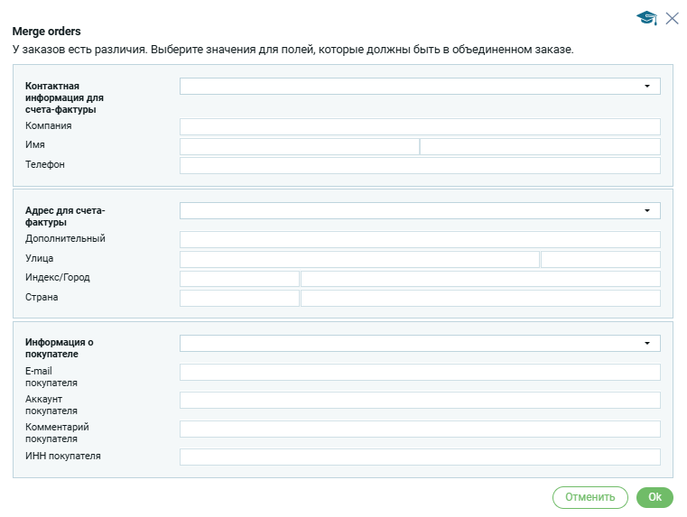 После клика по функции Объединить заказы появится модальное окно с сообщением про различия и поля для выбора единых данных для будущего обьединенного заказа.
