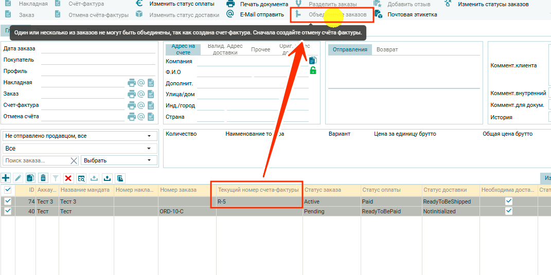 • Заказы не должны быть заархивированы. При обьединение заказов появится ошибка — заказы не могут быть объеденины, так как заказы заархивированы;
