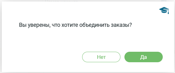 Если в выбранных заказах нет различий в контактах, методах оплаты и статусах, заказы не заблокированы для редактирования и еще не отправлены, то появится модальное окно с подтверждением обьединения заказов.