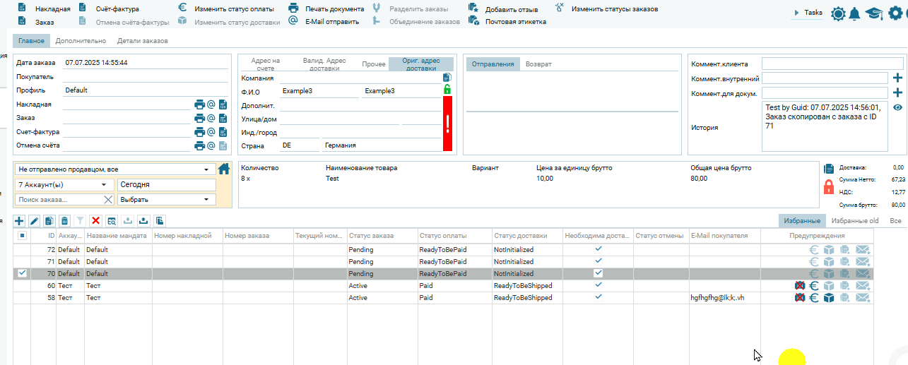 Если перейти к истории заказа, то можно увидеть, что заказ 73 получился путем слияния заказов 70,71,72.