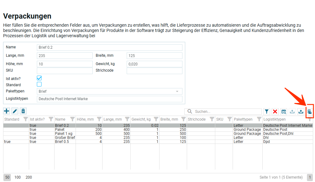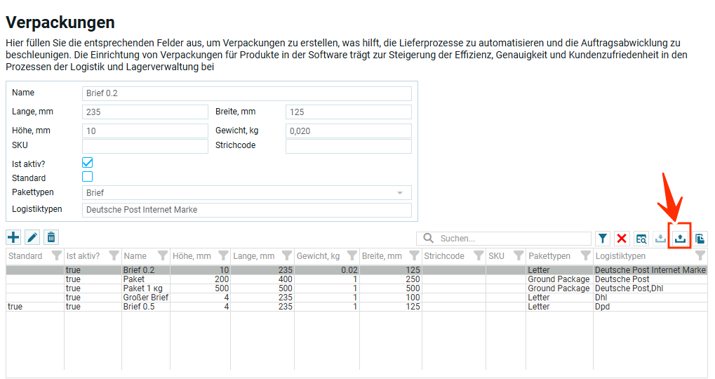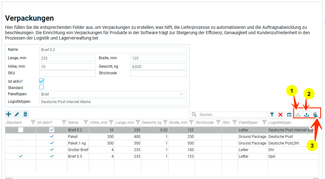 Внизу на скрине выделено три иконки: импорт данных, экспорт данных и иконка для выбора столбцов. Описание каждой функции ниже под таблицей.