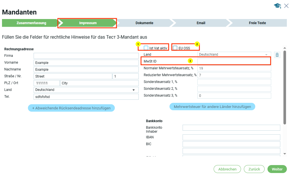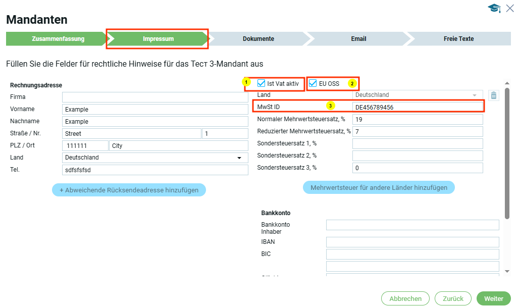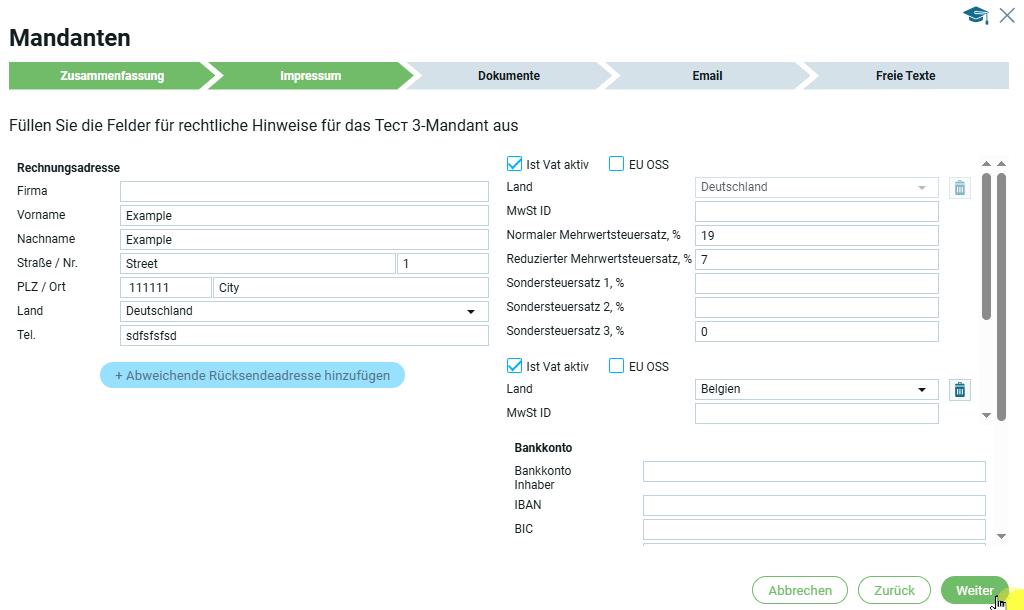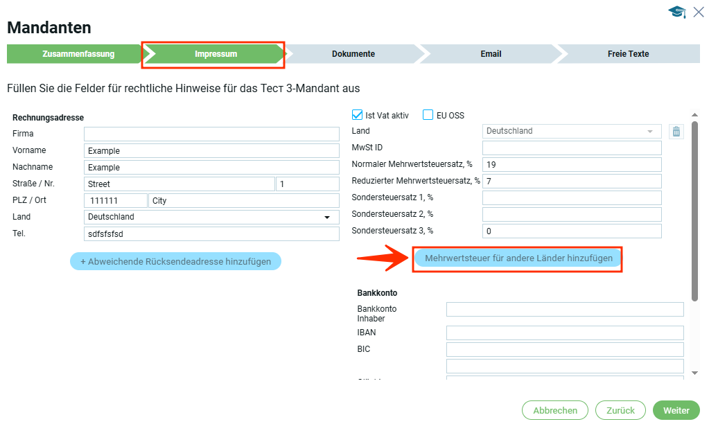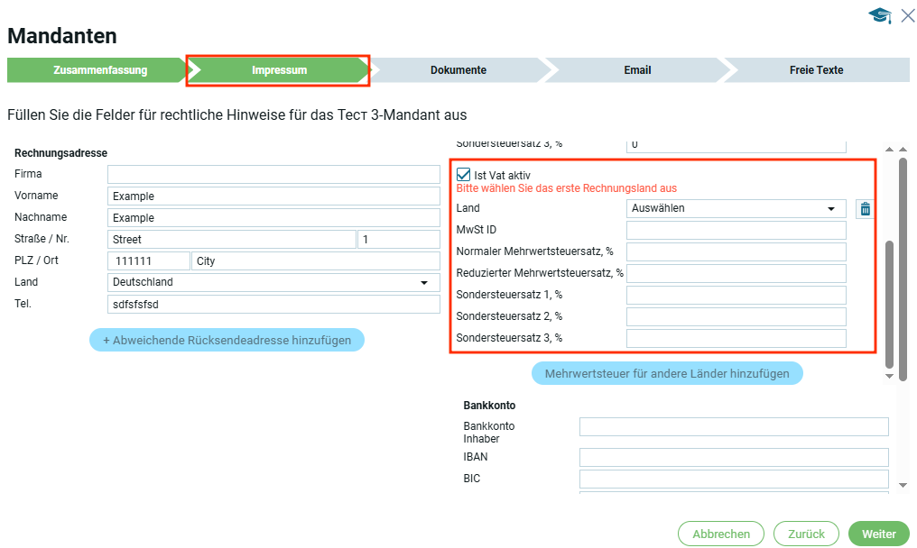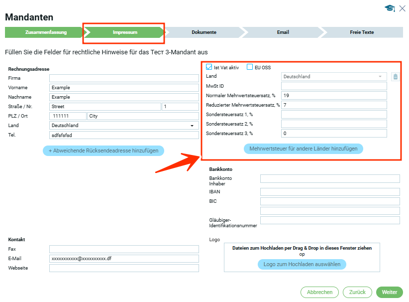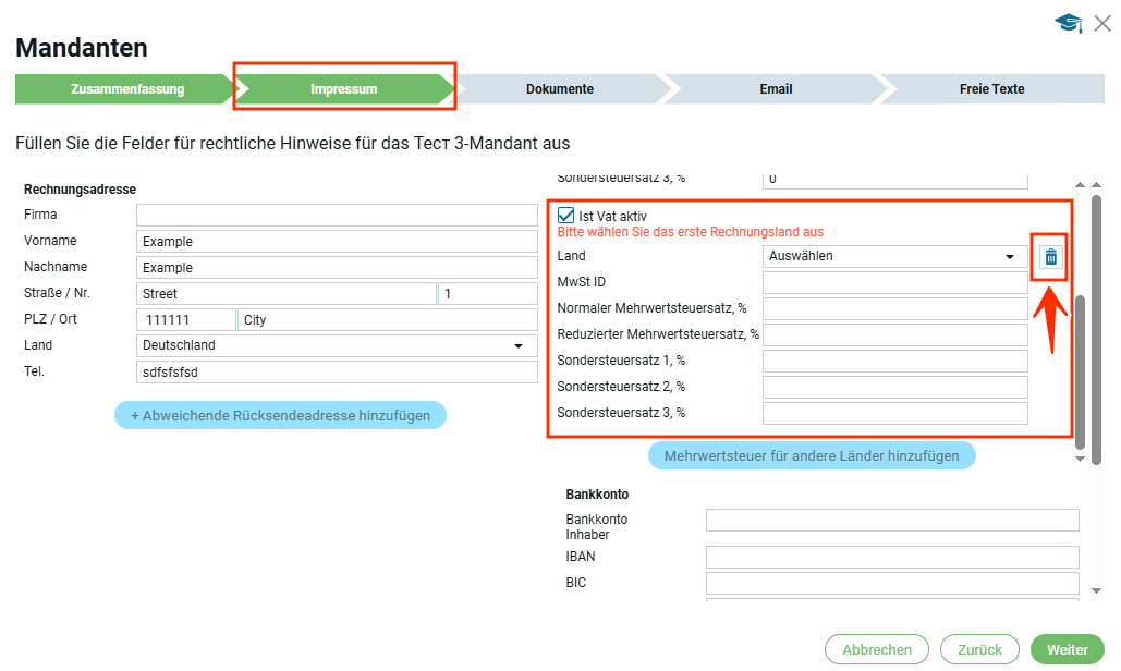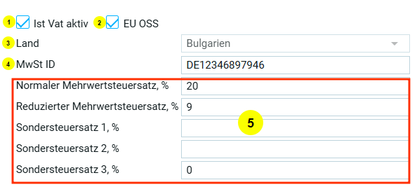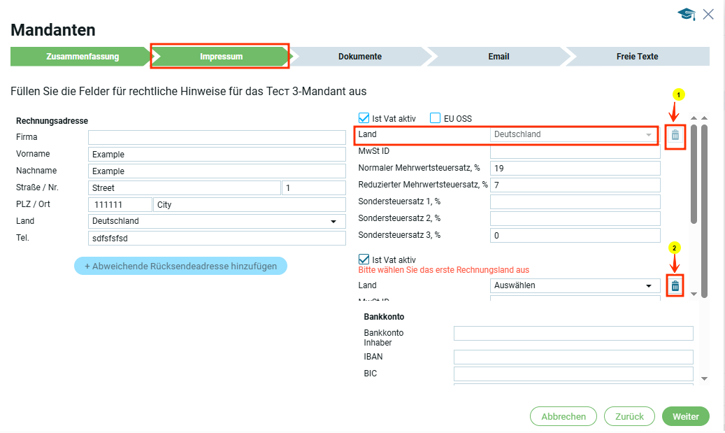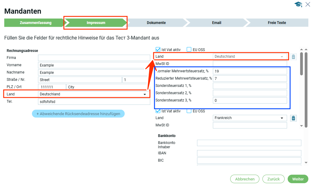 Если страна в блоке „Юридический адрес“ выбрана, например Германия, то в первом блоке „Информация по НДС“ страна автоматически будет Германия.