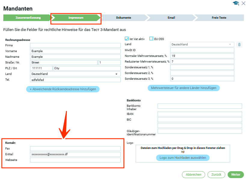 Выбрать вкладку „Правовая информация„, перейти к заполнению / редактированию контактов.