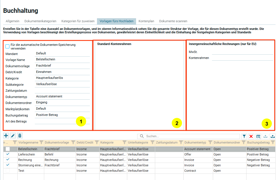 Перейти в „Настройки„, в списке настроек выбрать пункт „Бухгалтерия„. Откроется интерфейс для работы с настройками бухгалтерии. Далее нужно перейти на вкладку „Шаблоны для загрузки„.