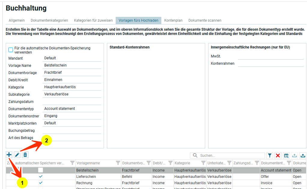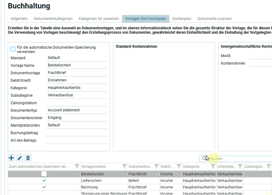 Перейти в „Настройки„, в списке настроек выбрать пункт „Бухгалтерия -> Шаблоны для загрузок„. Откроется интерфейс для работы с настройками шаблонов.