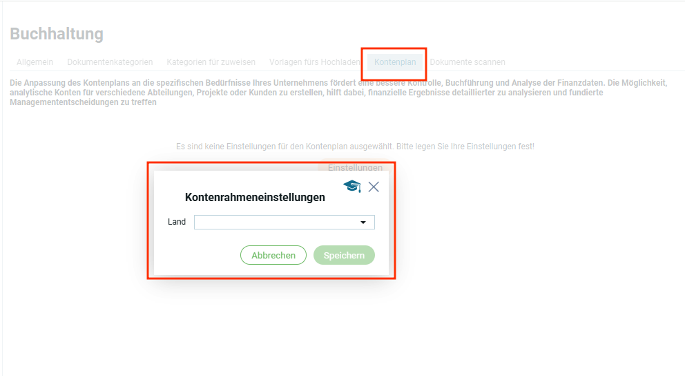 В открывшемся модальном окне выбрать страну ведения бизнеса к которой подтянется соответствующий план счетов.