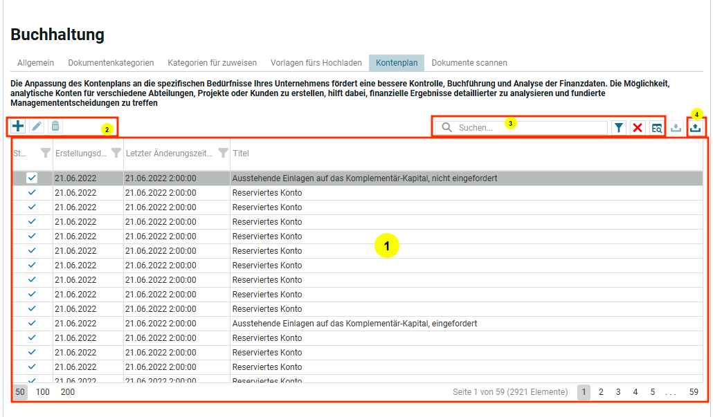 После загрузки план счетов в виде списка статей доходов и расходов будет отображаться в таблице, где можно редактировать, добавлять и удалять статьи.