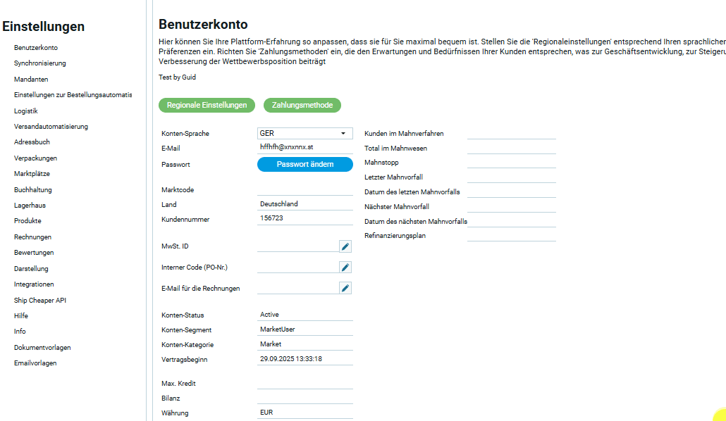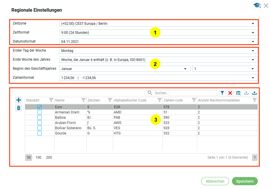 Ein Klick auf die Schaltfläche „Regionale Einstellungen“ öffnet ein modales Fenster, in dem drei Hauptbereiche mit Einstellungen hervorgehoben sind. Die Zahl im gelben Kreis entspricht dem jeweiligen Menüpunkt im rechten Sidebar.