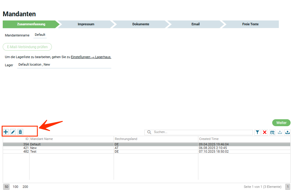 Кнопки управления организациями находятся в верхнем левом углу над таблицей