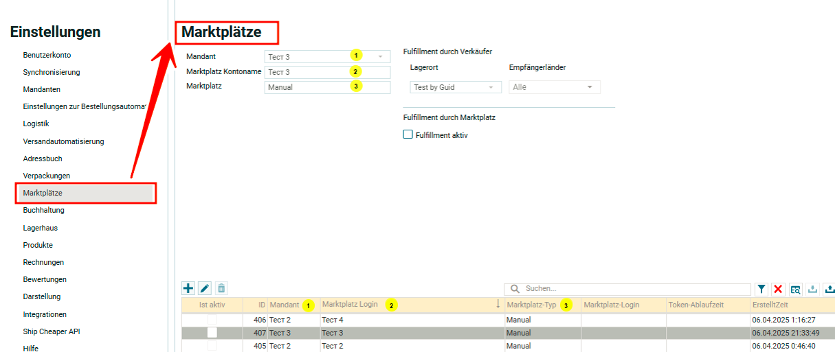 Перейти в настройки, вкладка «Торговые площадки» — в таблице «Default» мануальный аккаунт. Одним из основных параметров в аккаунте торговой площадки является Организация. В данном случае мануальный аккаунт (торговая площадка (3)) с названием «Default» (2) — организация «Default» (1).