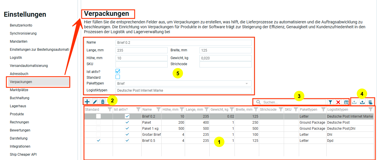 На скрине выделено 5 основных пунктов, нумерация которых соответствуют пунктам в сайдбаре справа. Каждый пункт содержит более подробное описание настроек. 6 пункт – создание / редактирование упаковки в модальных окнах.