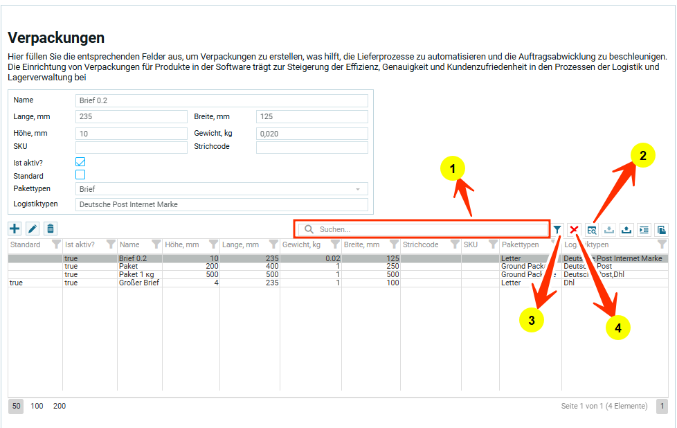 Функционал для оптимизации списка упаковок находится справа над таблицей упаковок.