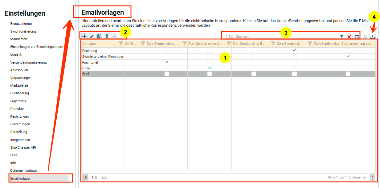 На скрине выделено 4 основных пункта, нумерация которых соответствуют пунктам в сайдбаре справа. Каждый пункт содержит более подробное описание настроек. 5-ый пункт – создание / редактирование шаблонов в модальных окнах.