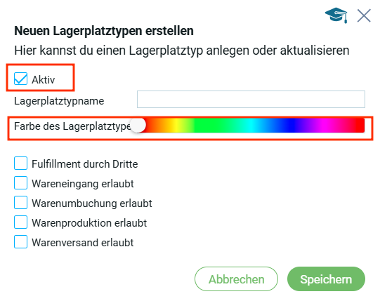 Выбранный цвет будет отображаться в модуле „Склад“ в складской локации, где будет выбран данный тип складской ячейки.