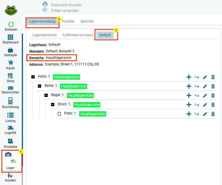 Переходим в Склад (1) -> Склад (2) -> Default location (3):