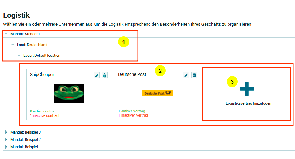 На скрине выделено 3 основных пунктов, нумерация которых соответствуют пунктам в сайдбаре справа в раздел Настройка логистики уровень первый. Логистики. Каждый пункт содержит более подробное описание настроек.