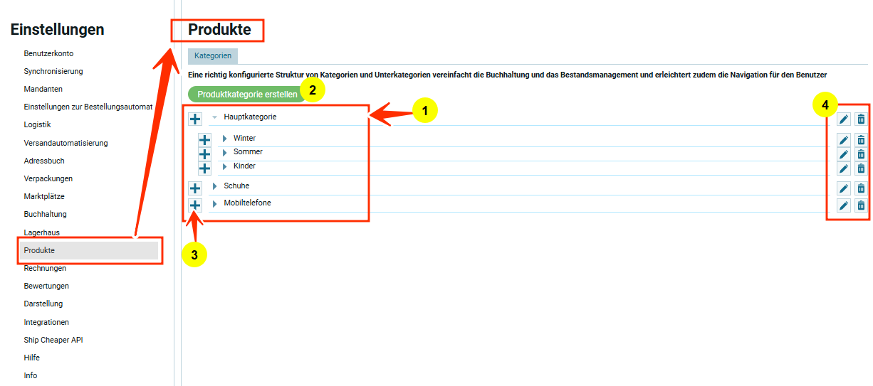 Дерево категорий и подкатегорий продуктов пользователь создает самостоятельно в соответствии с классификацией своего товара.