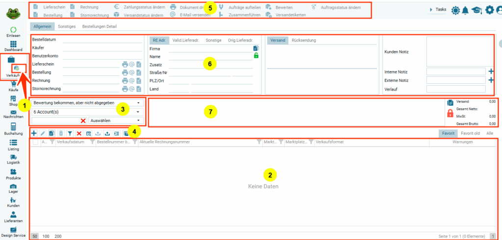 На картинке ниже отображен интерфейс для работы с заказами. В боковом левом меню эта вкладка называется „Продажи“. На скрине в интерфейсе выделены красной рамкой области, пронумерованные желтыми кружочками. Всего их 11 штук, столько же сколько пунктов в содержании с права от скрина.