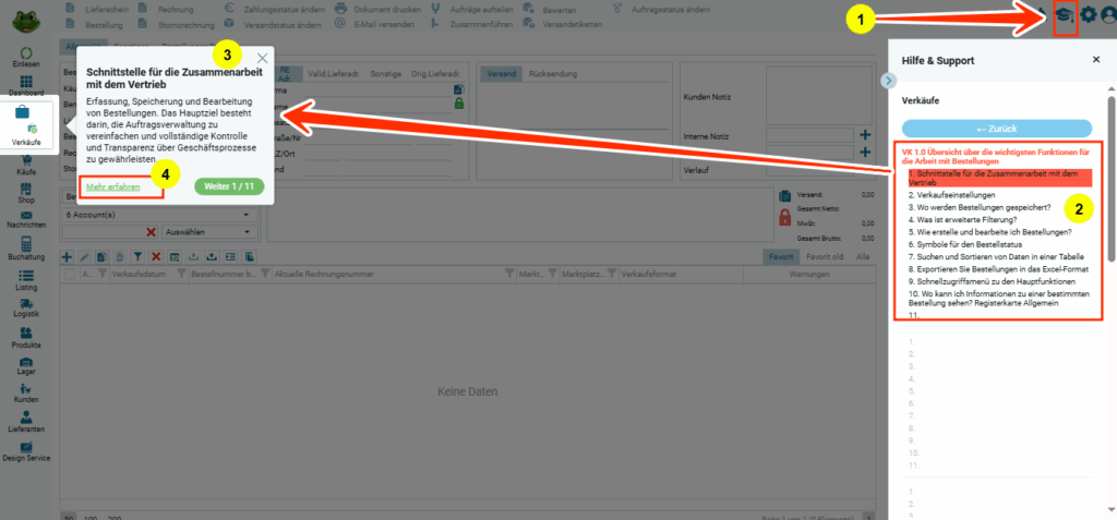 Пункты в содержании дублируют пункты в содержании сайбара (2). Запусти гид в программе, нажав на иконку в правом верхнем углу (1). Откроется содержание соответствующее интерфейсу продажи. В первом разделе содержания (2) ты увидишь название и пункты соответствующие данной странице. При нажатие на пункты будут открываться подсказки (3) с кратким пояснением назначения выделенной области. Нажимая на кнопку „Подробнее“ (4) пользователь попадет на страницу с подробным описанием выделенного объекта.