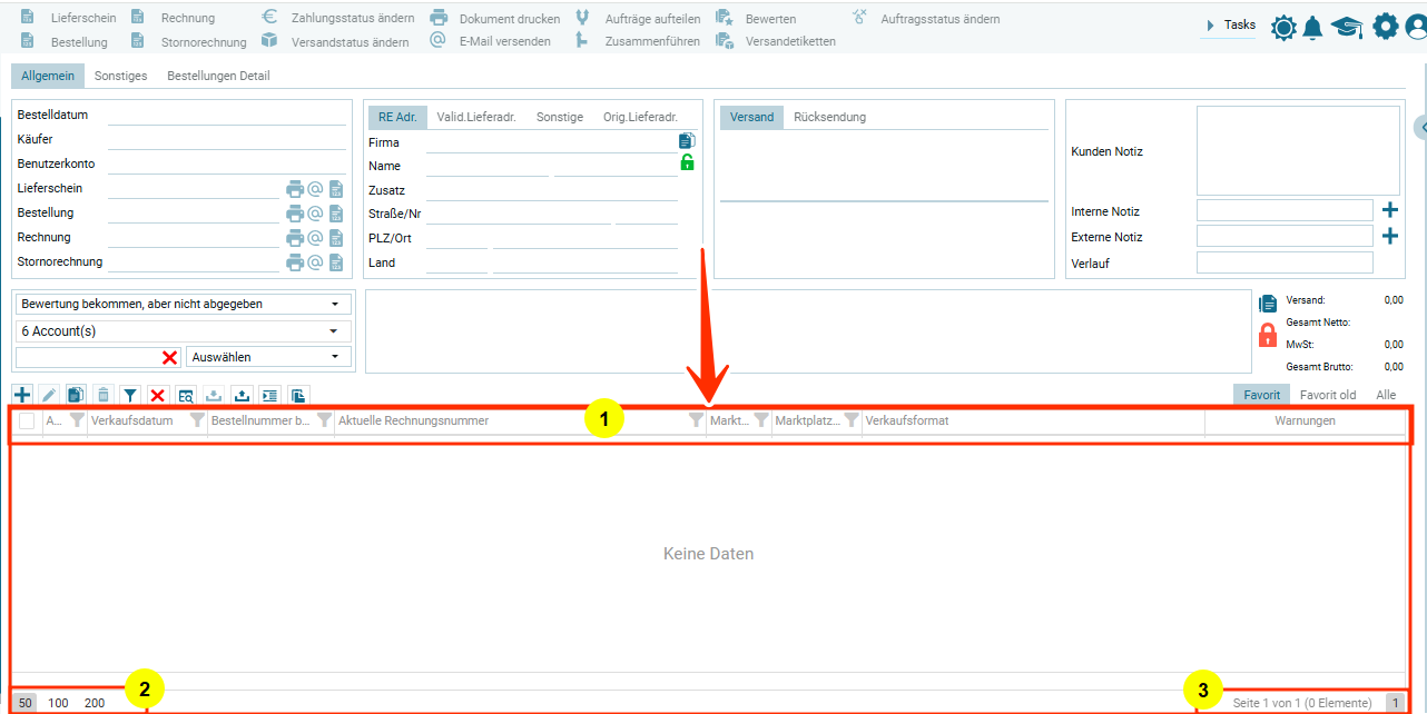 В левом нижнем углу (2) указано, сколько заказлв может отображаться на одной странице.