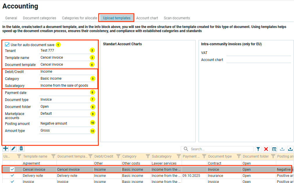 Например, если создан документ счет-фактура для оплаты, то значение в шаблоне и документе будет положительным. Далее, пользователь создает документ отмена счет-фактуры – в шаблоне и в документе соответственно будет стоять отрицательное значение.