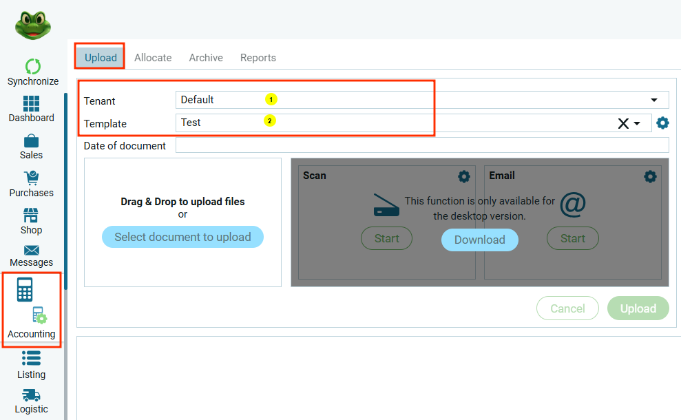 Если чекбокс неактивен, загрузка документа в систему осуществляется вручную через вкладку “Бухгалтерия → Загрузка“.