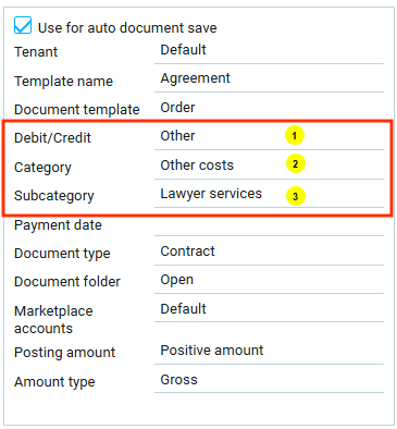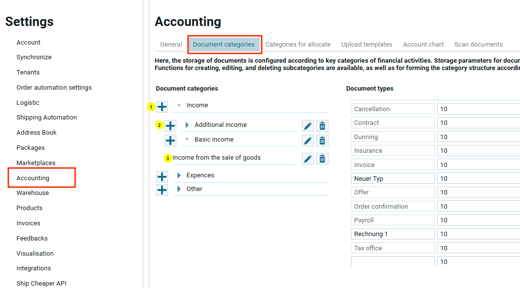 Категории документов создаются в “Настройках -> Бухгалтерия -> Категории документов“ и представляют собой дерево из трех уровней: