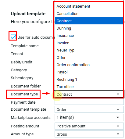 При создании шаблона для загрузки типы документов выбираются из выпадающего списка, сформированного на основе ранее созданных типов документов.