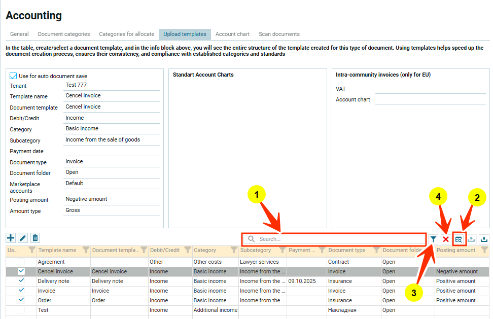 Функционал для оптимизации списка шаблонов находится справа над таблицей шаблонов.