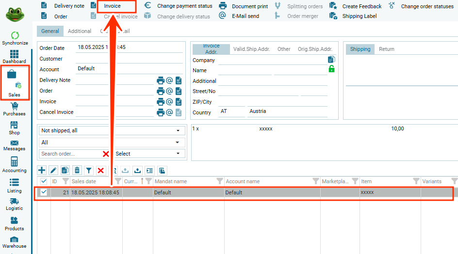 Пользователь выбирает заказ и нажимает в функциональном меню создать, например счет-фактуру.