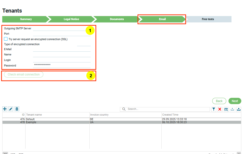 Организация в таблице «Example«. Первая вкладка «Основная информация» (1). В обзорном окне отображается название Организации (2), кнопка «Проверить подключение» (3) — проверка настроек электронной почты и информация по складам привязанным к Организации(4).