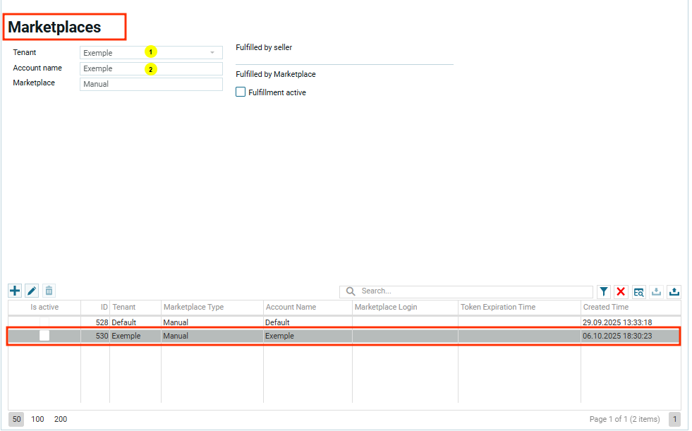 Перейти в настройки, вкладка “Торговые площадки” – в таблице “Default” мануальный аккаунт. Одним из основных параметров в аккаунте торговой площадки является Организация. В данном случае мануальный аккаунт (торговая площадка (3)) с названием “Default” (2) – организация “Default” (1).