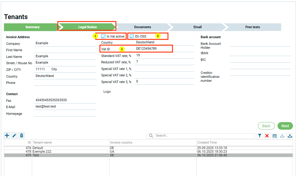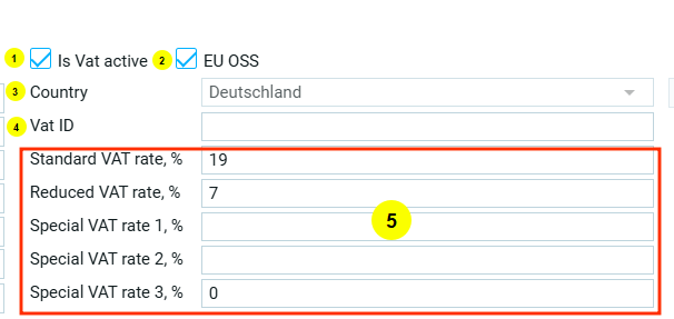 Если пользователь зарегистрирован в OSS (One-Stop-Shop), то будет отображен чек бокс с галочкой “EU OSS” (2).