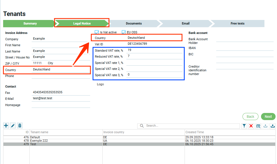 Если страна в блоке “Юридический адрес” выбрана, например Германия, то в первом блоке “Информация по НДС” страна автоматически будет Германия.