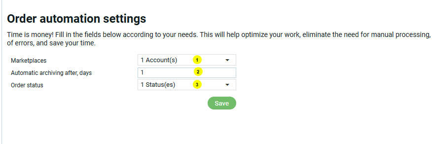 2. Автоматическое архивирование через (дни) — количество дней, по истечении которых заказы с определённым статусом и с выбранных торговых площадок будут скрыты из табличной части.