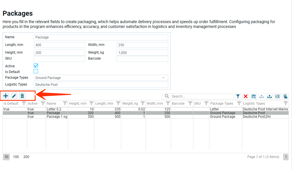 Кнопка отвечает за редактирование объектов в таблице. Выдели упаковку и нажми на кнопку. Откроется модальное окно для редактирования упаковки.