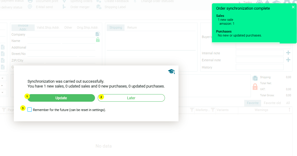 3. Чек-бокс “Запомнить на будущее” – после активации этой функции, заказы будут загружаться/обновляться автоматически без дополнительных вопросов. В настройках синхронизации способ обновления заказов переключится на “Автоматически“.