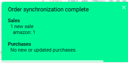 В случае выбора способа “Автоматически“, после осуществления синхронизации появляется сообщение об успешной синхронизации с количеством новых и обновленных покупок и продаж.