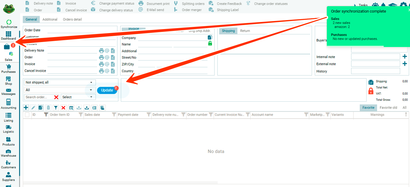 2. Кнопка “Позже” – заказы не будут обновлены и возле иконки во вкладках продажи и покупки появится мерцающий кружочек с количеством заказов, которые ждут своей загрузки/обновления. В данном примере покупок новых нет, поэтому мы видим кружечек только около продаж. Красный кружочек также появится в правом верхнем углу на кнопке “Обновить“, на которую нужно будет нажать, когда пользователь примет решение об обновление/загрузке синхронизированных заказов.