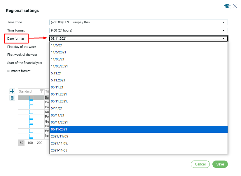You can select the desired date format from the dropdown list: