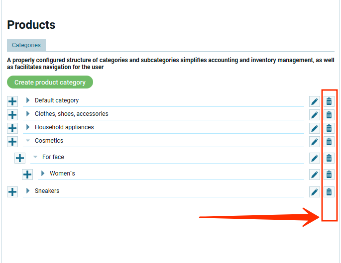 Для удаления категории / подкатегории нужно нажать на кнопку слева от названия категории.