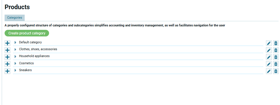 Ты самостоятельно формируешь структуру категорий товаров в системе. Это позволяет максимально адаптировать классификацию под особенности ассортимента, бизнес-процессов и логики хранения.