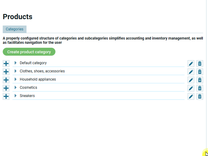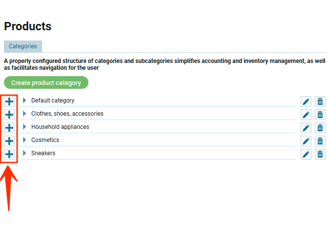 Для создания подкатегории нужно нажать на кнопку слева от названия категории.