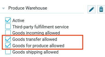 - Производство товаров разрешена – это значит, что в данной складской ячейке разрешено осуществлять операции, связанные с производством или сборкой товаров.