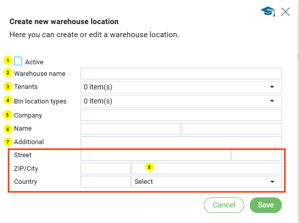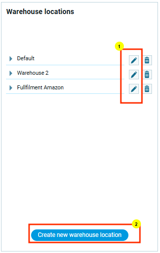 (1) . Для создания новой складской локации – нажать на синюю кнопку “Создать новое местоположение склада” (2).