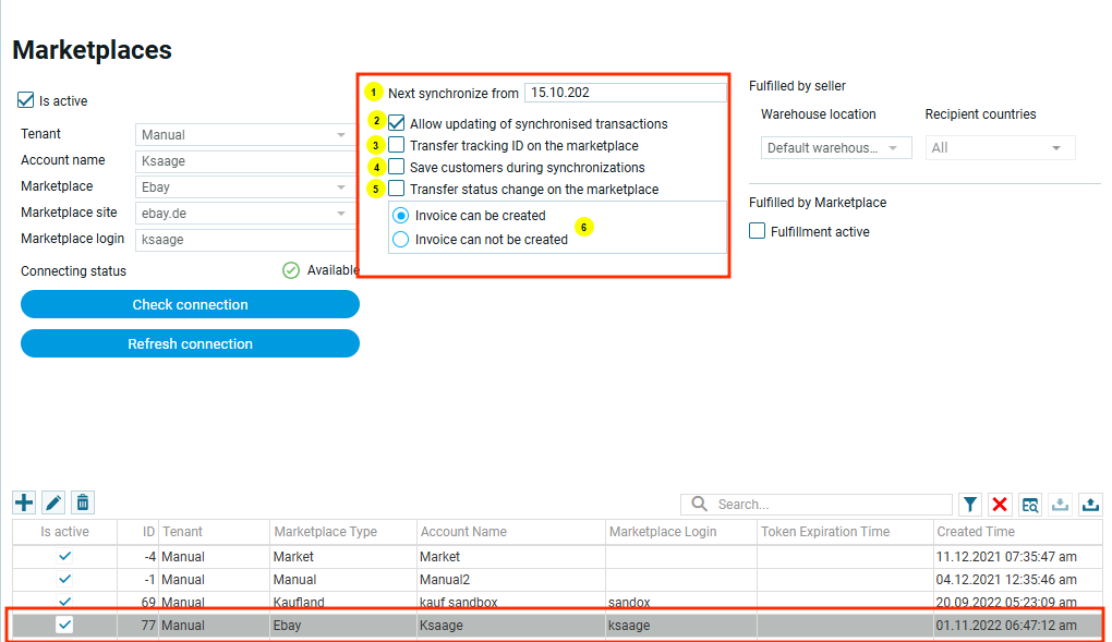 - Разрешение/запрет на создание счет-фактуры (6) – определяет, будет ли возможным создавать документ “Счет-фактура” (invoice) в ERP на основе заказов импортированных с торговой площадки или нет.